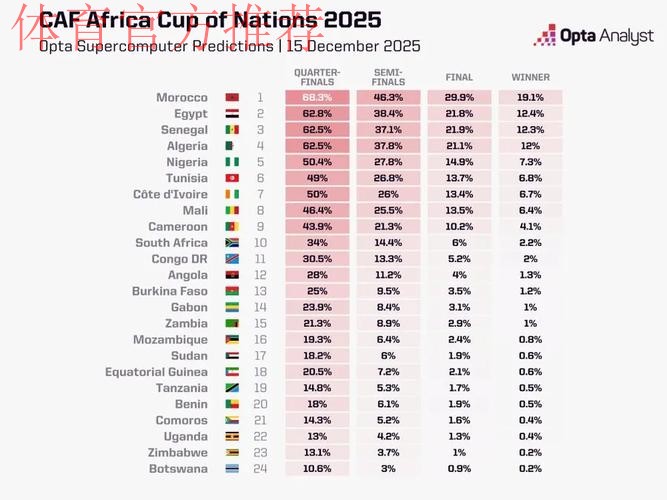 查看更多非洲杯新格局 摩洛哥领跑夺冠概率的背后逻辑 非洲杯向来被认为是充满变数的洲际赛事,但在当下的数据时代,情绪与传统印象正逐渐被理性分析所取代。当权威数据机构 Opta 公布最新的非洲杯夺冠概率后,
